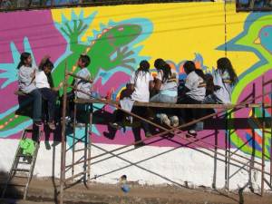 They were surrounded by children in the neighborhood, who were fascinated and who also began painting the mural.