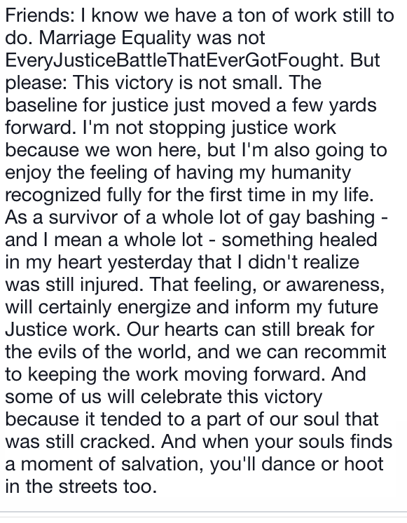But I have cried the last few days because I wish she was here to see these pictures…to have the chance to marry me, legally, in my home state… I wish she was here to see that the work we did in the 90s was NOT in vain… I wish we could have been part of that celebration.